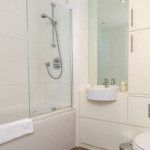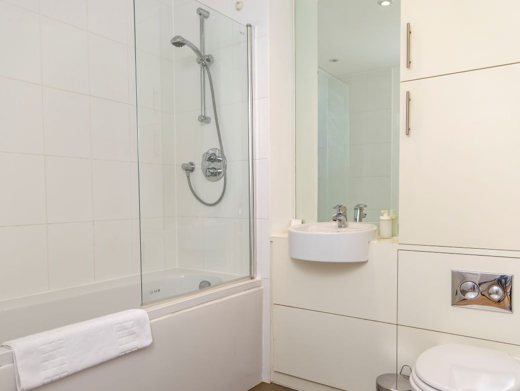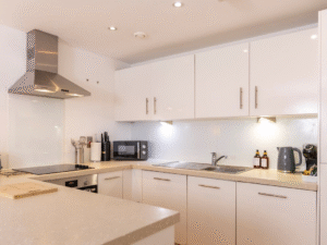 This modern apartment offers a bright, open-plan living space perfect for families, couples, or small groups. The primary bedroom features a super king bed (convertible to twins) and an ensuite shower room, while the second bedroom has twin singles (convertible to a super king). A family bathroom with a bath and shower over completes the sleeping areas.
